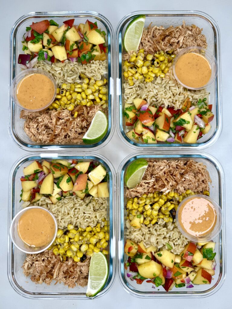 If you’re looking for a healthy, meal prep–friendly recipe that doesn’t taste like “meal prep food,” then try these Smoky Chipotle Chicken Bowls. They feature smoky, juicy shredded chicken paired perfectly with sweet and tangy peach salsa. Plus, add fluffy rice and a creamy chipotle aioli drizzle to finish.